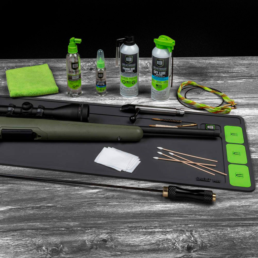 The Breakthrough Shield Mat for Rifles and Shotguns is a premium maintenance mat designed to streamline cleaning and repair tasks for larger firearms. Crafted from durable, easy-to-clean PVC, this mat provides a reliable, protective surface for your workspace. It features three embedded magnets to securely hold small parts, preventing loss and ensuring efficiency. With dedicated compartments for organized storage and a size tailored to accommodate rifles and shotguns, this mat is an essential tool for firearm enthusiasts. Proudly made in the USA, it combines durability, functionality, and convenience.