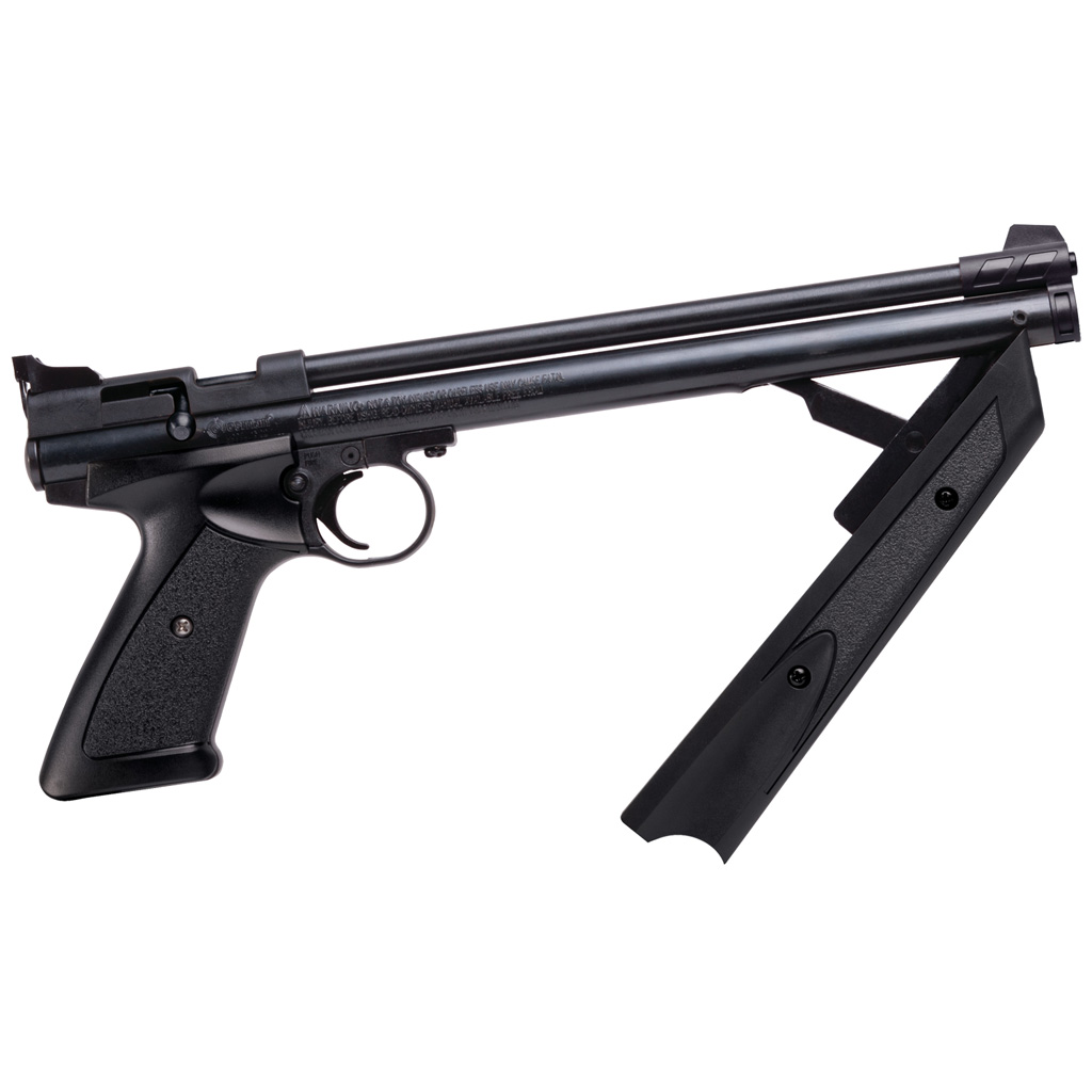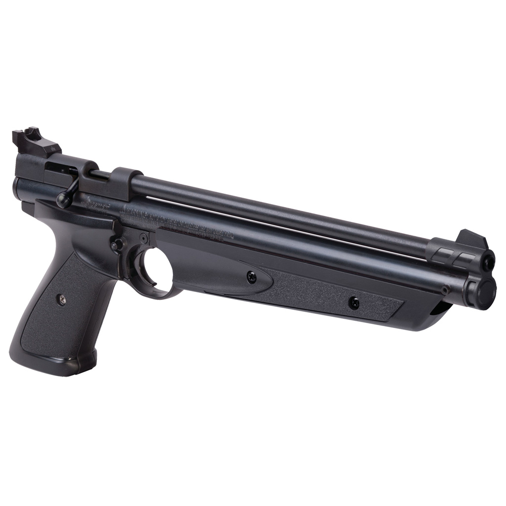 Pneumatic air pistol features a single action bolt design for easier cocking and loading. Easy pump forearm is used for variable pump power. Equipped with an adjustable rear sight and fixed blade front sight. Shoots up to 300 FPS.