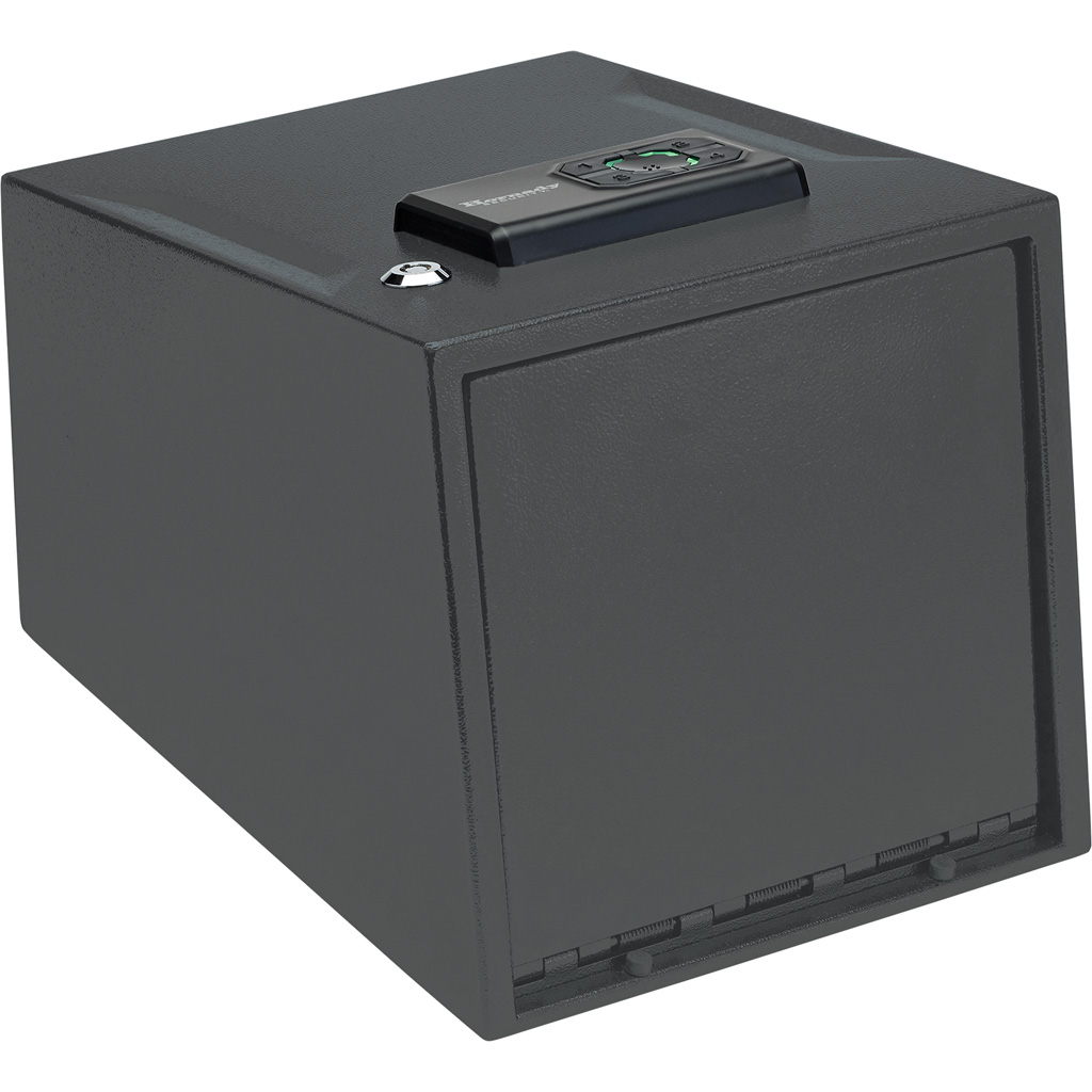 This Two-Gun Keypad Vault has a removable shelf to provide twice the storage space while it sits on a desk or nightstand. Secured by a programmable 4 to 6 digit code and 16-gauge steel. Protective foam lines the interior to protect from scratches or marring. A spring-loaded door opens to reveal the illuminated interior. Selectable audio and visual low-battery indicators remind you when to change the four AAA batteries (not included), a backup barrel key is included. This box fits 1911-size pistol and 4-inch revolvers. Exterior dimensions are 12.7” x 9” x 8.8”. Interior dimensions are 11.4” x 8.6” x 6.3”.