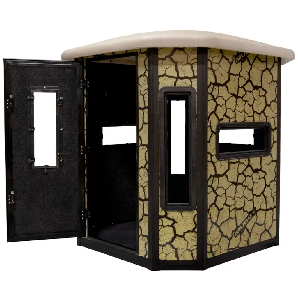 The Muddy Bull ST Box Blind with Elite 5 ft. Tower is built for hunters seeking superior concealment, comfort, and durability. Featuring all-steel wall construction and a cracked mud exterior pattern, this blind seamlessly blends into the environment. Its advanced Therma-Tek wall panel technology provides year-round thermal, scent, and noise control, while the dark, carpet-covered interior minimizes movement visibility and sound. The heavy-duty roto-molded roof offers complete weatherproofing, keeping you dry in any conditions. The blind includes four vertical and three horizontal windows with steel friction hinges for secure positioning at any angle. The Elite 5 ft. Tower provides an elevated vantage point with a sturdy steel construction for long-term stability. Proudly made in the USA, this blind ensures a premium hunting experience.