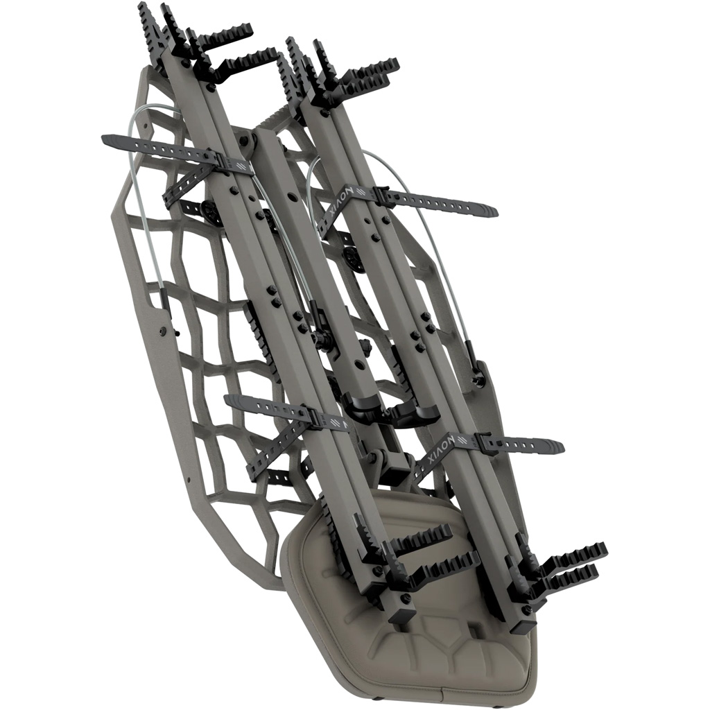 The Novix Echo Hunt Ready Hang On Combo provides everything you need for a mobile and hassle-free hunting experience. This comprehensive package includes the Echo Hang On Treestand, 32" Single-Step Climbing Sticks, and Quickstraps, all delivered ready to use with no assembly required. Designed for maximum comfort and stability, the system features leveling capabilities, a durable aluminum build, and Frost Coating for a low-glare finish. Proudly made in the USA, it meets rigorous standards, ensuring safety and reliability in the field.
