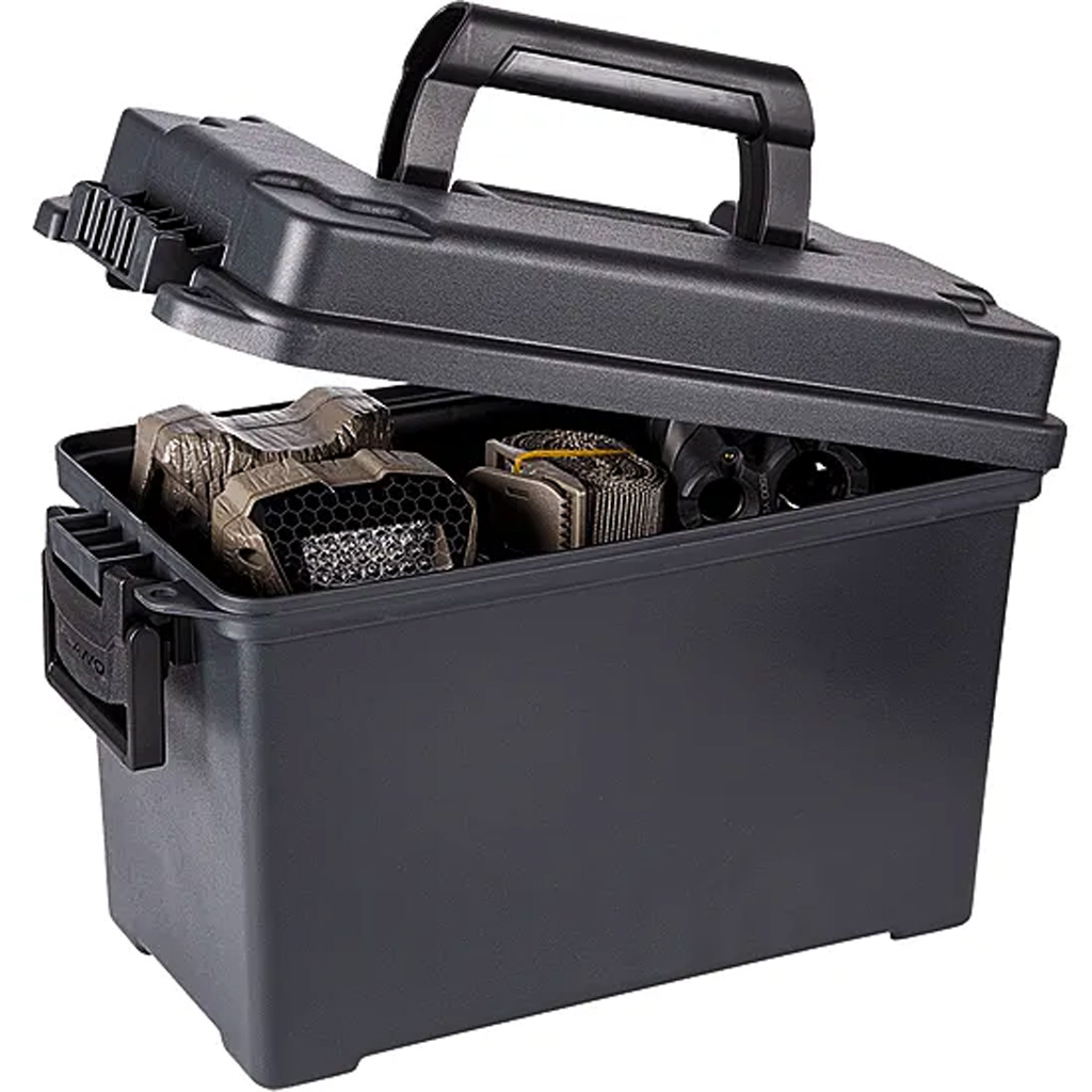 The Plano Field/Ammo Box is a compact and durable storage solution designed for .50 caliber ammo and a variety of other essentials. Built from high-impact polymer, this box provides secure, weather-resistant storage for ammunition, tools, electronics, and more. Its heavy-duty latch and reinforced hinge ensure long-lasting durability, while the folding carry handle offers easy transport. With medium-sized dimensions, this versatile box is perfect for use in the garage, basement, range, or work shed.
