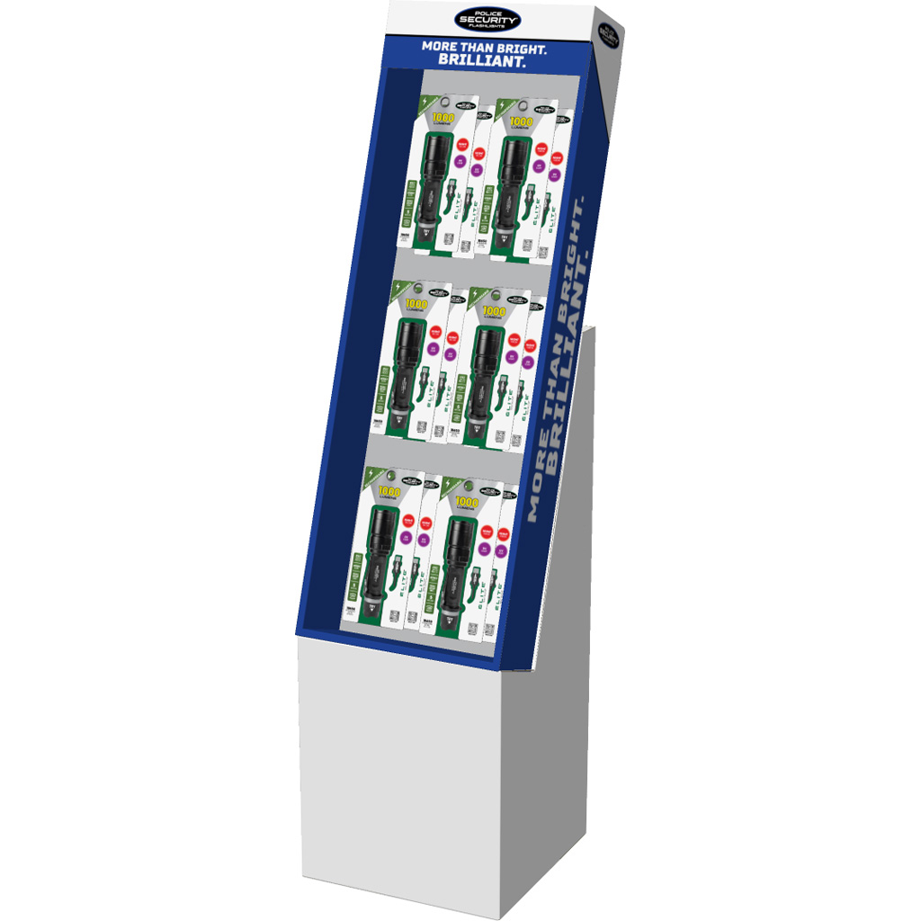 The Police Security Trac Tact Preloaded Display offers 12 pieces of the Trac Tact R flashlight, conveniently packaged for drop-ship orders only. Featuring ultra-bright illumination, multiple light modes, and UV tracking capabilities, the Trac Tact R is designed for hunters, outdoor enthusiasts, and tactical users. This preloaded pegged display provides an easy retail solution, allowing for efficient stocking and convenient customer access. Each flashlight is impact-resistant, water-resistant, and built for rugged durability.