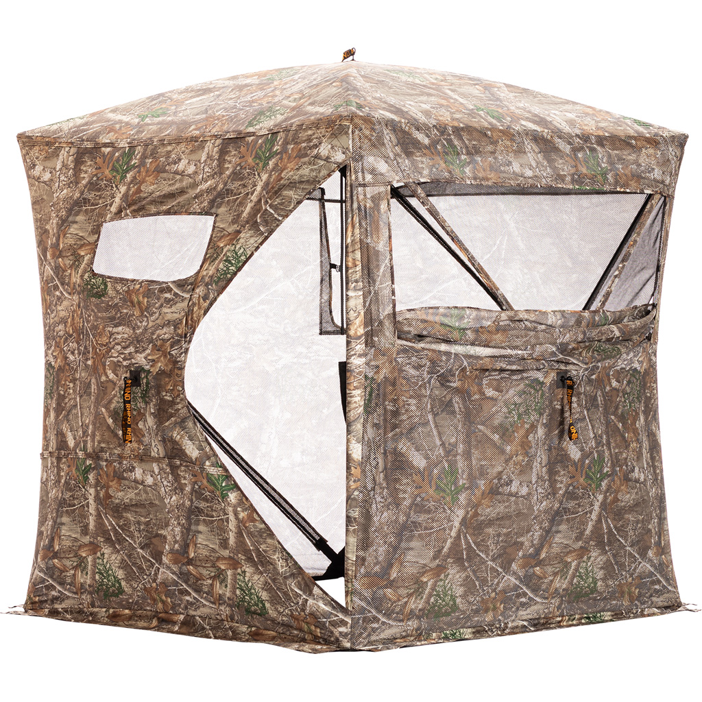 The Rhino 270 Blind in Realtree Edge features full-panel mesh that allows for an almost unobstructed field of view, reducing exterior glare and maintaining concealment. This 58” x 58” blind, suitable for three hunters, features removable black interior panels for customizable visibility, and its durable 150 Denier fabric ensures weatherproof reliability. The five-hub design promises easy setup and takedown, and the package includes a backpack-style carry case, tie-down ropes, and ground stakes for secure and stealthy placement in any environment.