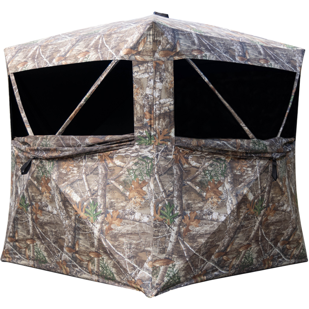 The Rhino RB140 3-Man Blind offers durable, weather-resistant concealment for group hunts or extra gear space. Constructed from tough 150D fabric, this hub-style blind is built to endure rain, snow, wind, and hail. Designed for three hunters, it features a 58 x 58-inch footprint with a 66-inch center height and weighs only 12 pounds for easy transport. The 180-degree silent-slide, double mesh see-through windows provide wide visibility while maintaining concealment and minimizing movement noise. Ideal for setting up 3–4 days before a hunt to blend into the surroundings effectively.