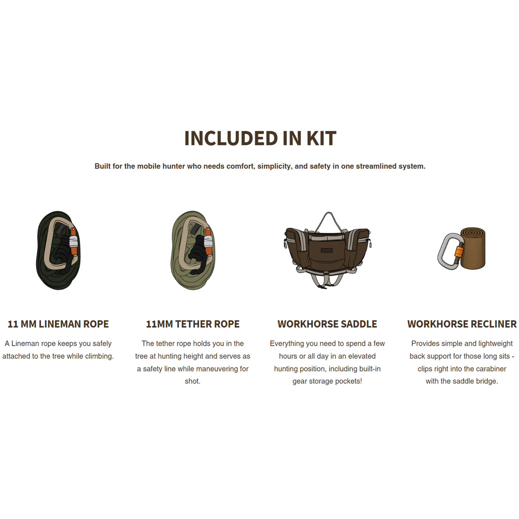 The Workhorse Saddle Kit in Timber Solid offers an affordable yet high-quality entry into saddle hunting, designed by the experts at Tethrd. With 360-degree maneuverability and built-in spacious pockets, this saddle provides unparalleled comfort and safety, holding all your essential gear like ropes, gloves, and range finders. Available in Regular and XL sizes, this saddle kit includes a 11mm lineman rope, 11mm tree tether, and recliner backband, making it a complete, budget-friendly solution for hunters seeking comfort and reliability in any tree.